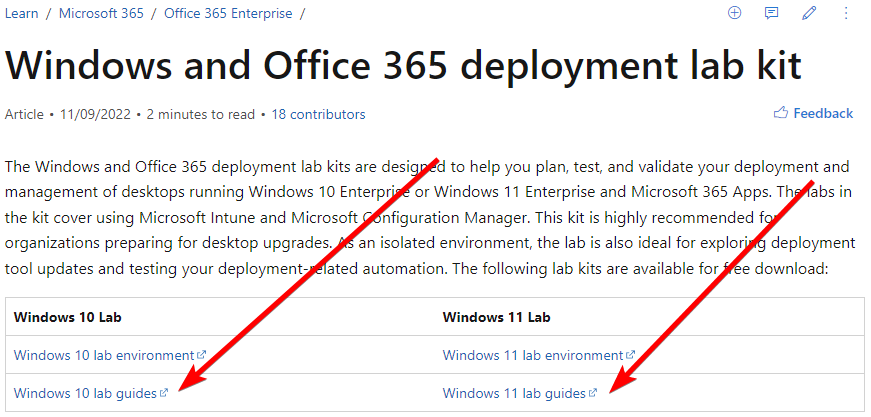 This page has links to a Windows 10 (or 11) lab environment and guides. These labs will help you plan and test a deployment of desktops and M365 Apps. The labs cover Microsoft Intune and Microsoft Configuration Manager.